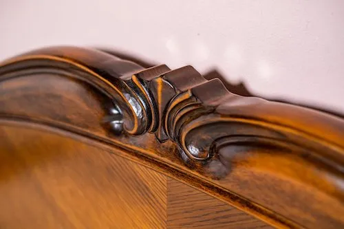 優雅なラインと大胆な彫刻が存在感を放ち、頼もしささえ感じる重厚感あるベッドフレーム。